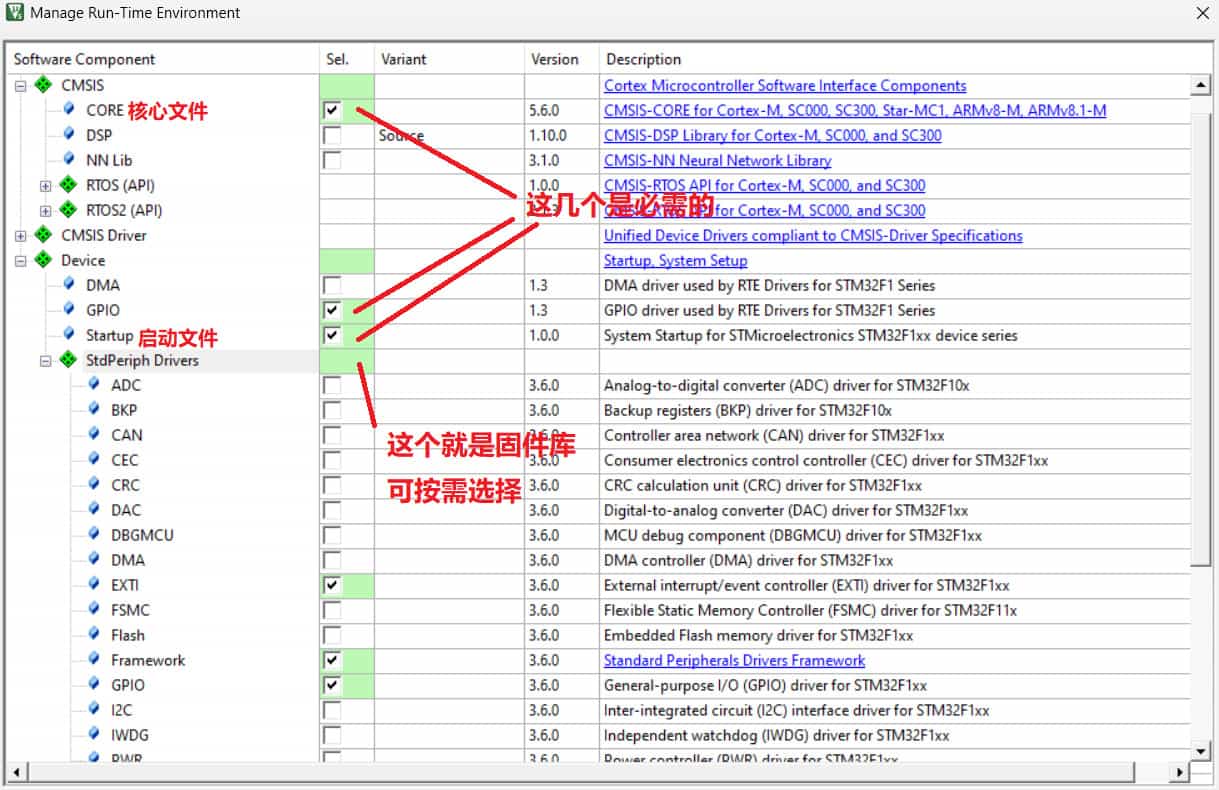 正点原子和野火的教程都是使用了工程模板,里面包括了CMSIS、固件库、启动文件等一系列可能会使用到的文件。但实际项目中,并不一定会用到所有外设,多余文件的存在会拖慢编译速度,尤其是在使用V5编译器的时候;同时还会使工程臃肿,占用较大空间。