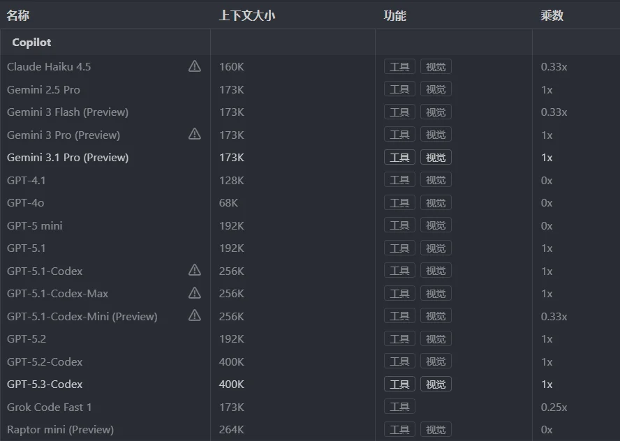 实际上 Copilot 目前还有两个比较能用的模型:Gemini3.1Pro 和 GPT5.3-Codex,反正先凑合用几天吧,我估计之后很快就会再次收缩了。