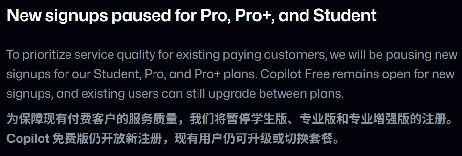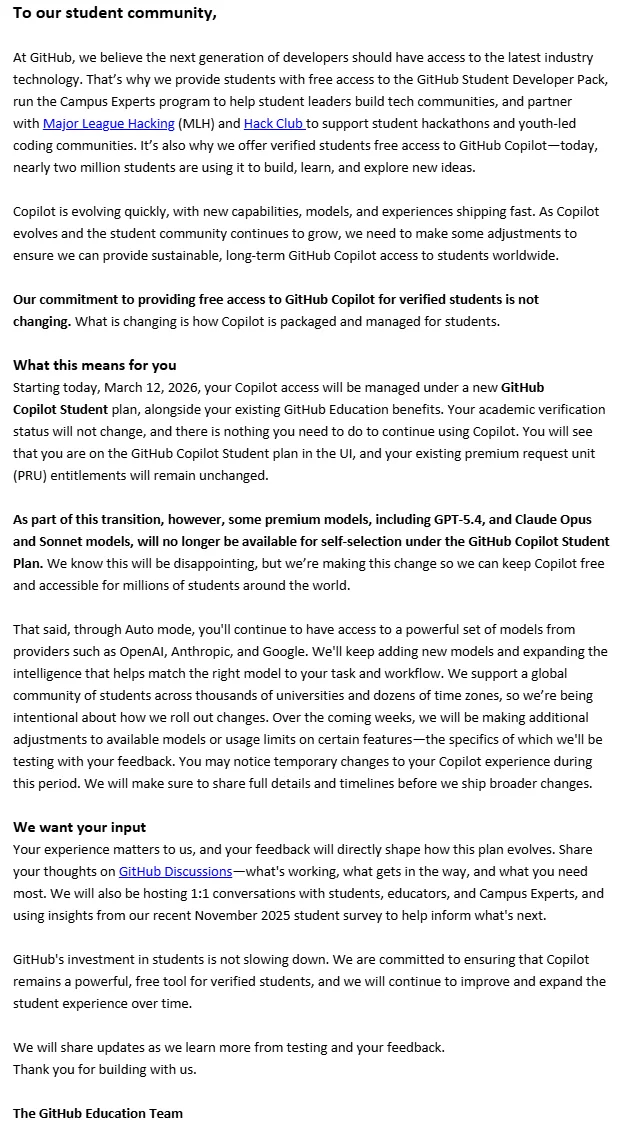 "As Copilot evolves... we need to make some adjustments to ensure we can provide sustainable, long-term GitHub Copilot access to students worldwide." (翻译:用的人太多了我们亏不起了,为了可持续发展,我们要砍权益了。)